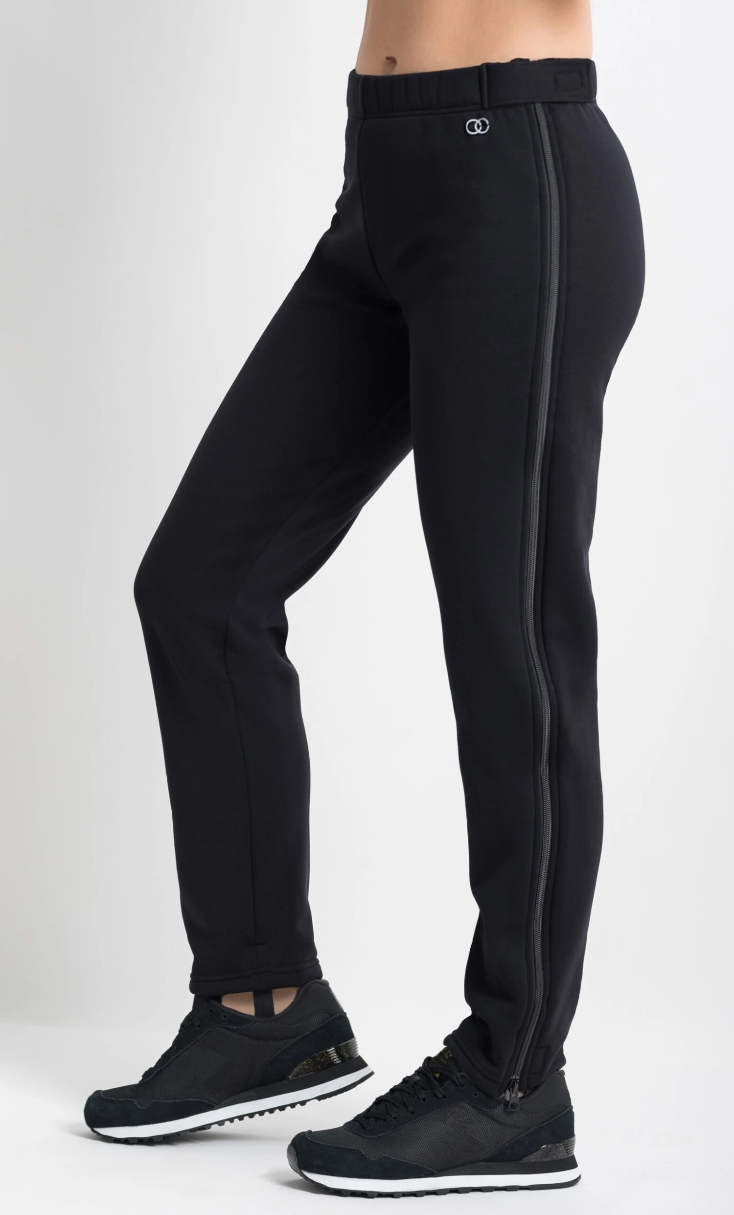 Polartec pants with full length zipper on each side, 1 1/2″ folded elastic at waist, Removable stirrup. Keep warm between sessions without taking off your skates.