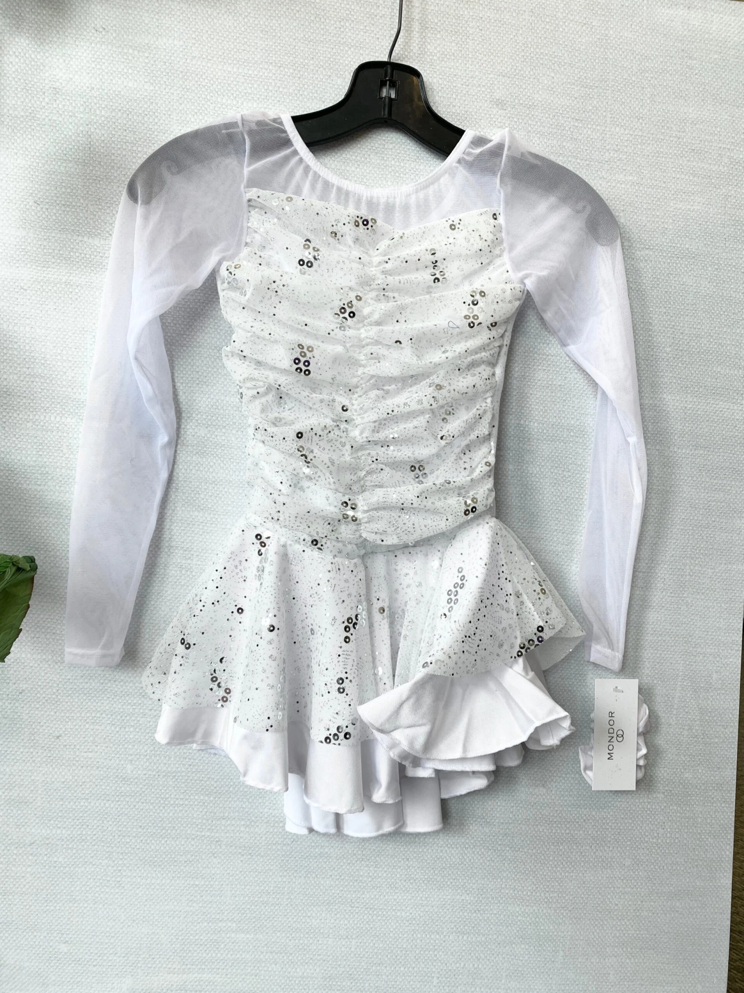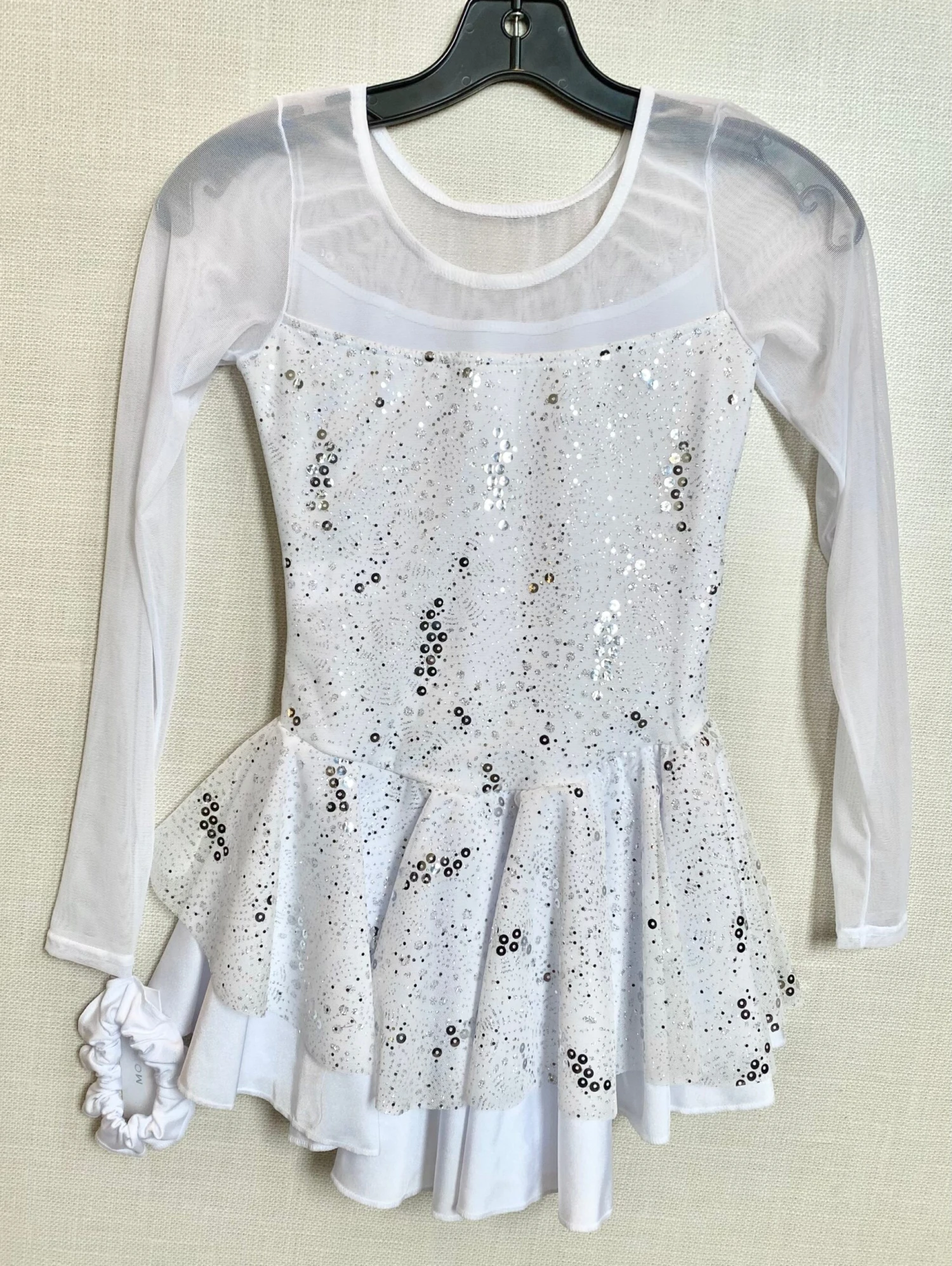 Glitter velvet dress, Mesh at neckline and sleeves, Strap at back. Full skirt lined with mesh