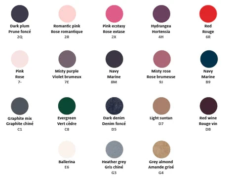 | Color | Misty Purple, Copper, Hydrangea, Red Wine, Evergreen, Navy, Almond, Olive, Charcoal, Ruby, Dark Suntan |